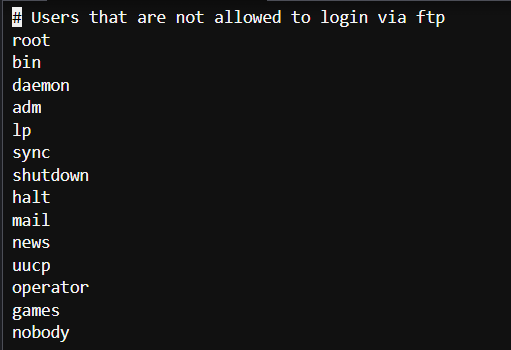 - vsftpd 설치 시 제공되는 파일로 vsftpd 서버에 접근 불가능한 사용자 목록을 지정한다.
