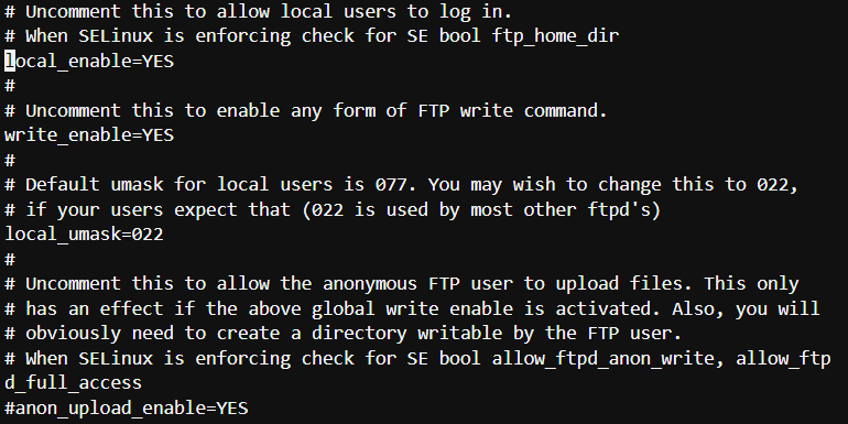 local_enable=YES // 시스템에 등록된 사용자의 접근을 허가한다.