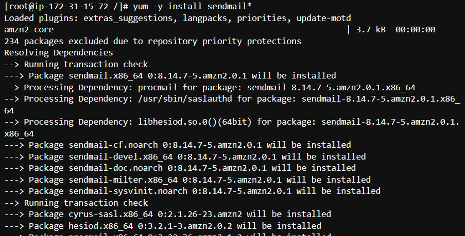 - yum 패키지로 sendmail에 관한 모든 패키지를 한번에 설치한다.