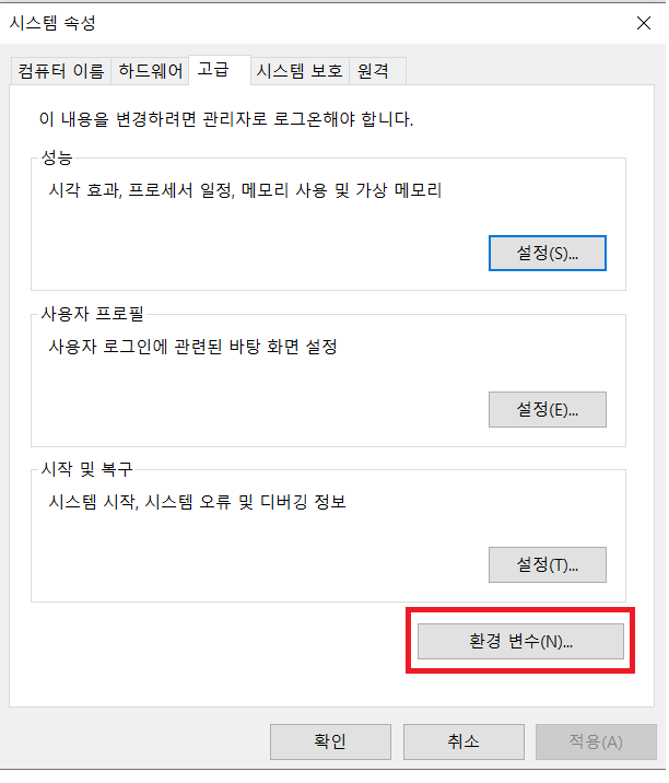 내 컴퓨터 마우스 우측 클릭 > 속성 > 고급 시스템 설정 들어가면