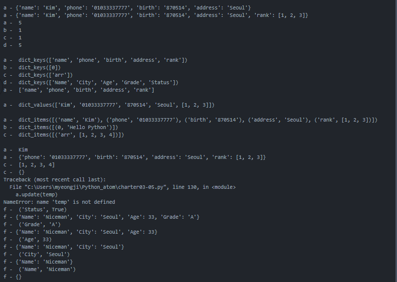 a = {'name' : 'Kim', 'phone' : '01033337777', 'birth' : '870514'}
