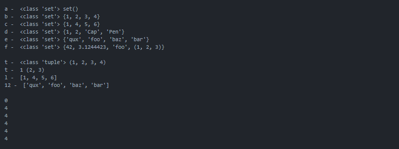 f = {42, 'foo' , (1,2,3), 3.1244423}
