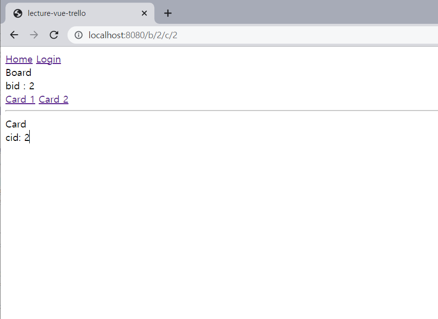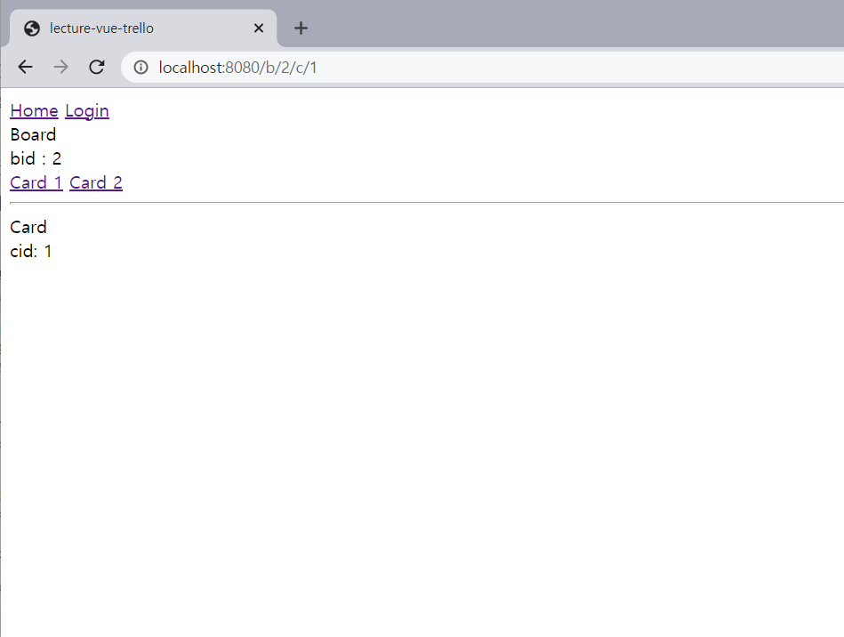 상위 컴포넌트인 board 컴포넌트에서 중첩 컴포넌트 card를 렌더링하기 위해 router-view 태그를 선언하였다.