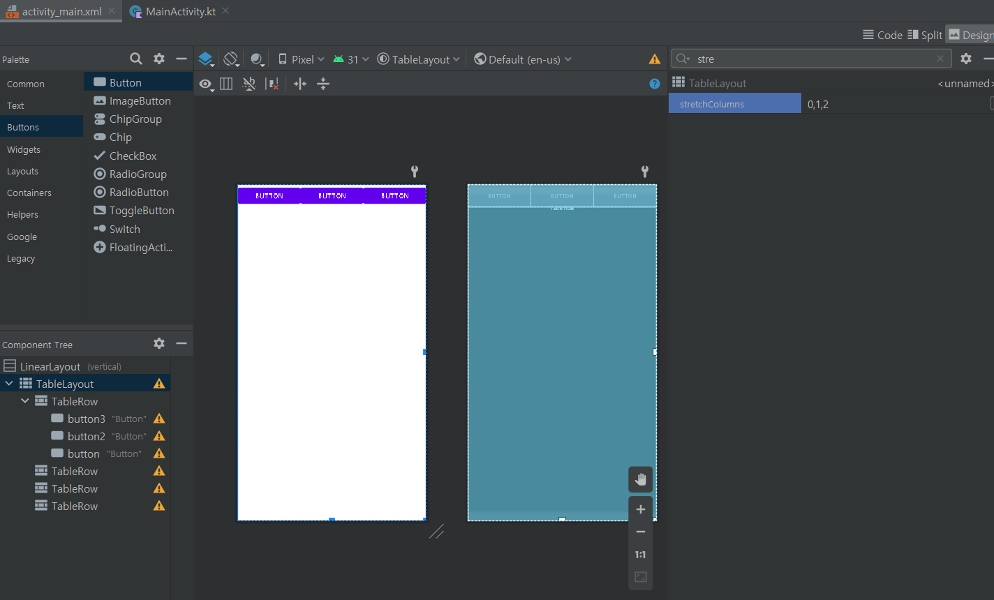 - stretchColumns : TableRow 안에 view 들이 가로로 늘어날 비율을 설정한다, 똑같은 가로 비율로 늘림