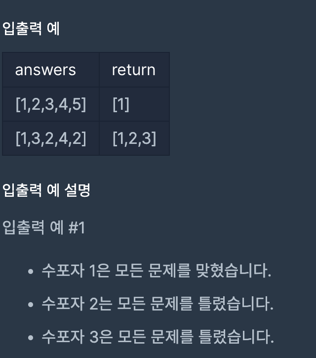 1번 문제부터 마지막 문제까지의 정답이 순서대로 들은 배열 answers가 주어졌을 때, 가장 많은 문제를 맞힌 사람이 누구인지 배열에 담아 return 하도록 solution 함수를 작성해주세요.