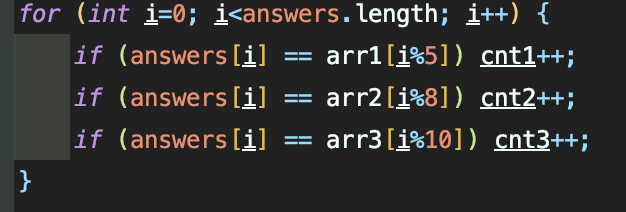 답 answers과 비교해서 값이 같은 개수 대로 cnt1, cnt2, cnt3 에 맞춘 개수를 저장한다.