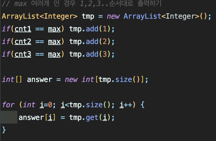 max 에 포함되는 녀석들만 array 배열에 수포자1번 index, 수포자 2번 index, 수포자 3번 index....순서대로 저장한다.