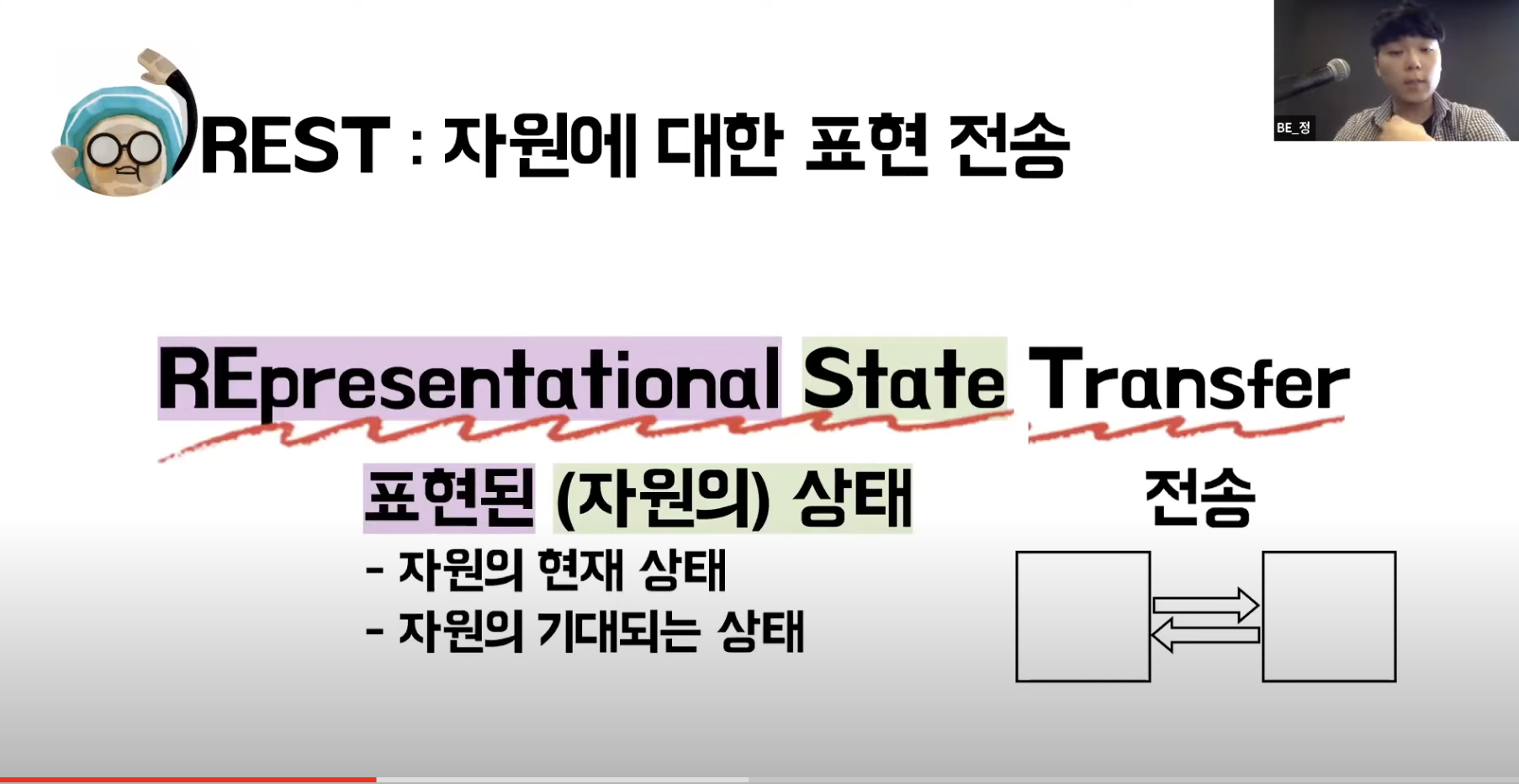 HTTP URI(Uniform Resource Identifier)를 통해 자원(Resource)을 명시하고, HTTP Method(POST, GET, PUT, DELETE)를 통해 해당 자원에 대한 CRUD Operation을 적용하는 것을 의미한다.