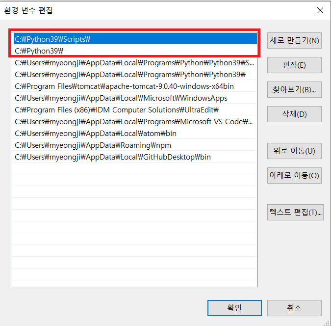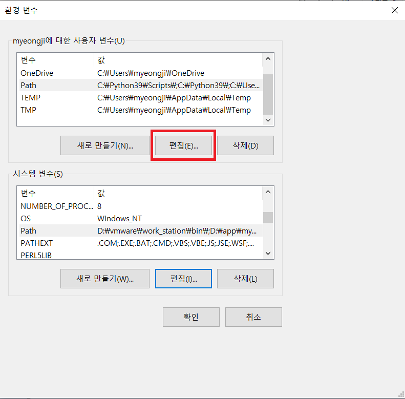 환경 변수에 대한 편집 버튼을 눌러 python이 설치되어 있는 경로를 수정합니다.