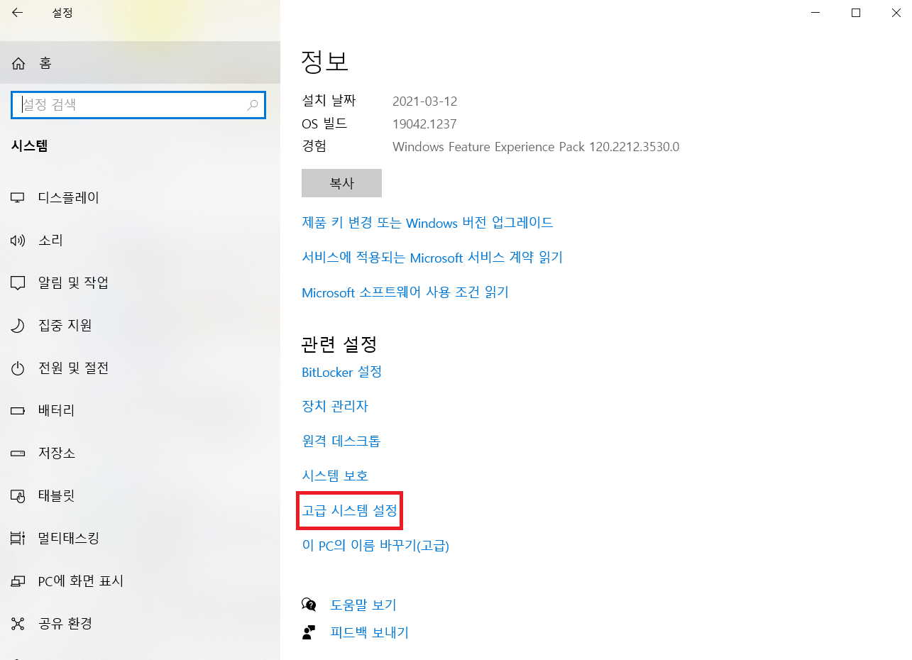내PC 오른쪽 클릭 후 속성 -> 시스템정보 -> 고급 시스템 설정으로 들어갑니다.