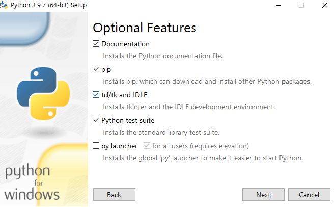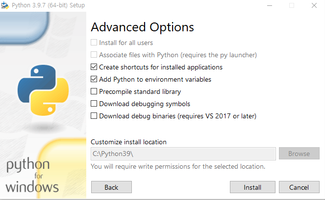 파이썬 설치 경로는 기본적으로 C:\Python39\ 으로 지정하는 것을 권장합니다.