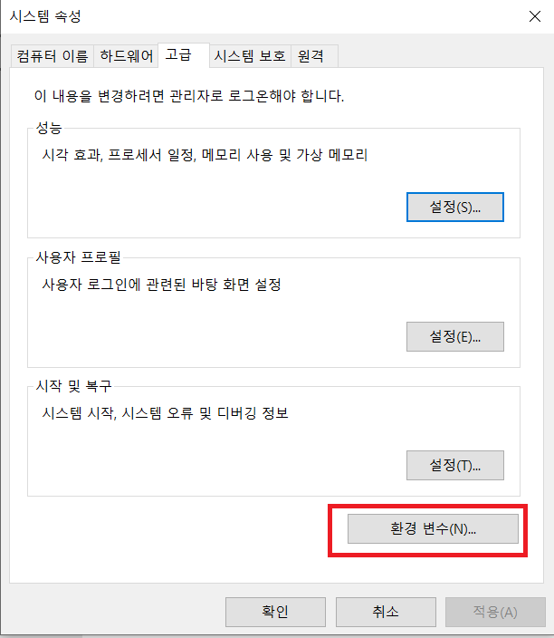 만약 환경 변수를 설정을 직접 변경하고 싶거나 확인하고 싶다면 아래 과정처럼 하시면 됩니다.