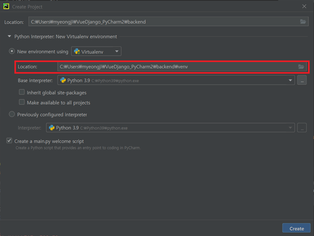 다른 프로젝트에서도 이 가상환경을 사용할 수 있도록 Make available to all projects를 체크해 줍니다.