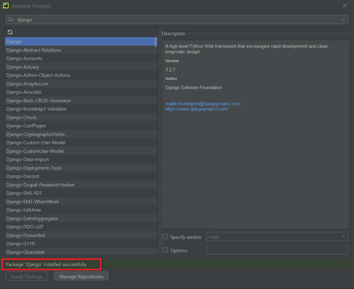 Package 'Django' intalled successfully가 나오면 설치가 완료된 것입니다. ok 누르고 나옵니다.