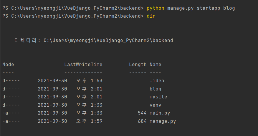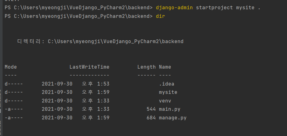 mysite라는 이름의 폴더를 현재 프로젝트에 생성합니다. 프로젝트 이름은 자신이 원하는 이름을 설정해 주면 됩니다.