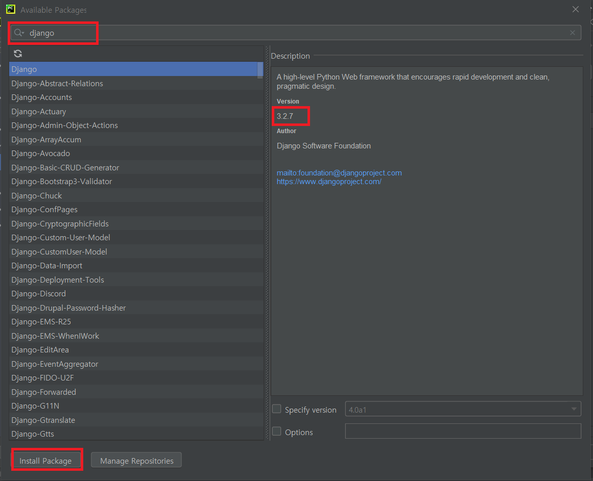 django 검색 후 버전 확인 하고 Install Package 누르고 장고를 설치합니다.