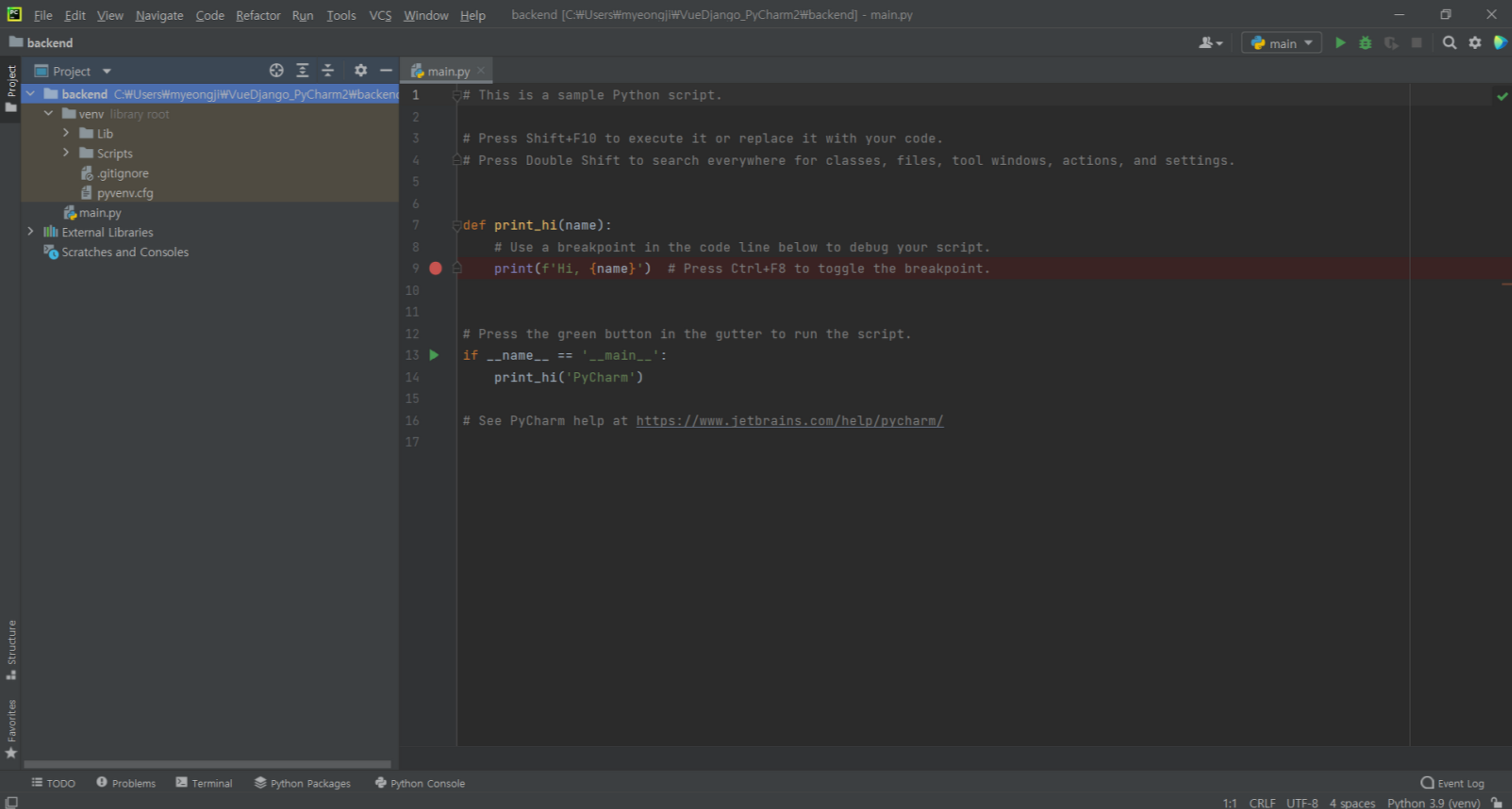 새 프로젝트와 venv 가상환경이 잘 생성되었습니다.