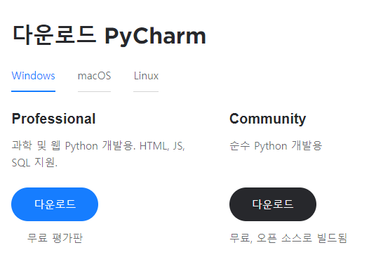 https://www.jetbrains.com/ko-kr/pycharm/download/#section=windows