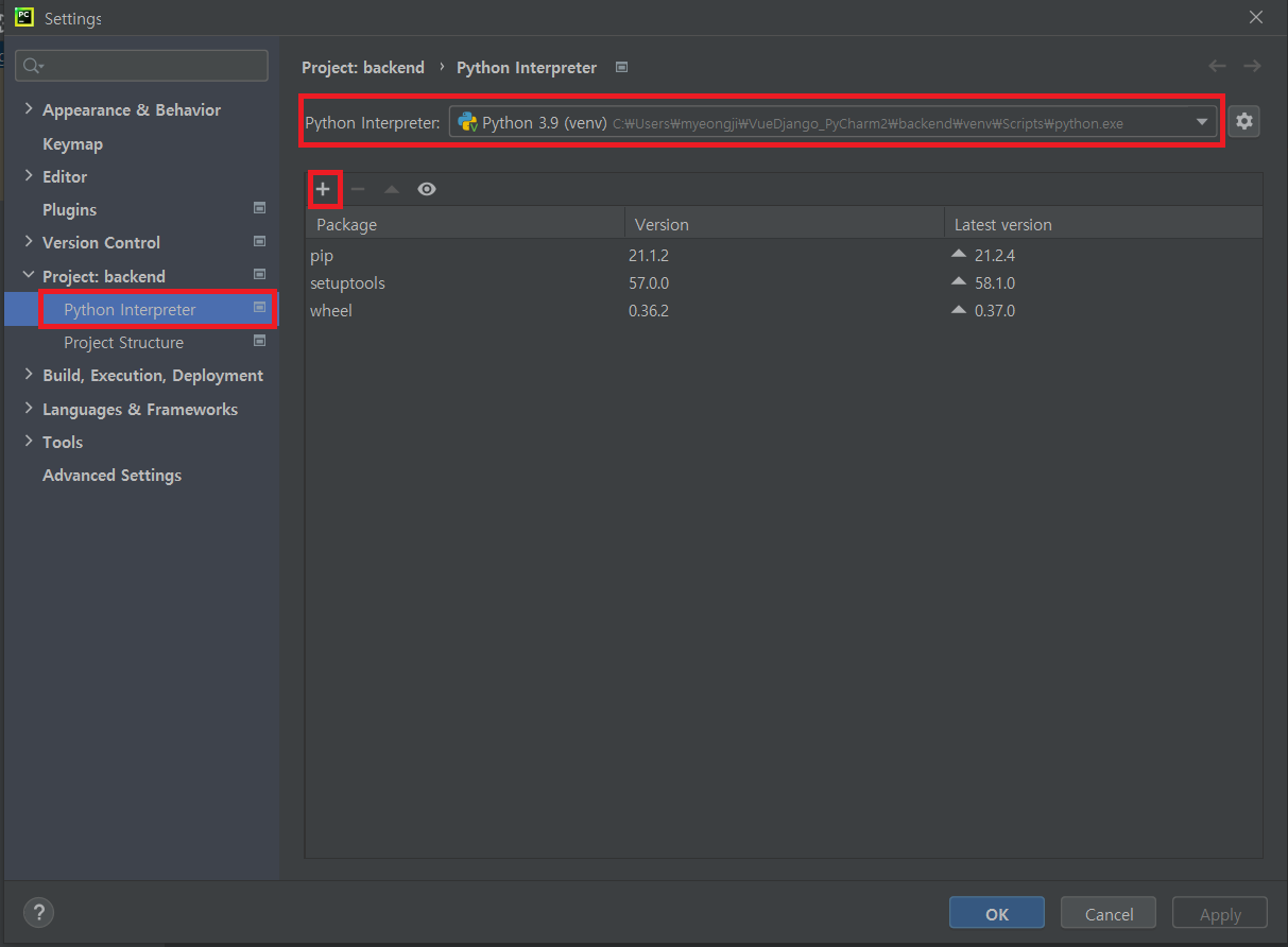 Python Interpreter 누르고 프로젝트 내의 가상환경 경로를 선택해줍니다.