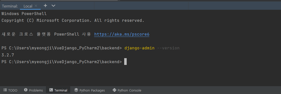 django-admin --version 입력 후 버전 정보가 나오면 성공적으로 설치가 된 것입니다.