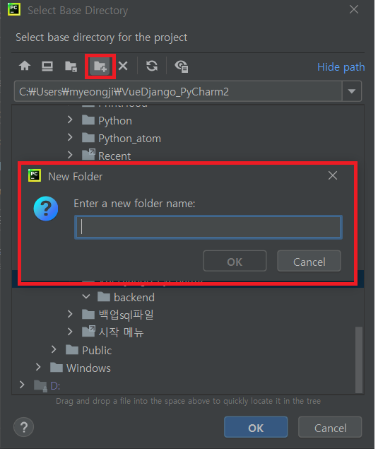 파이참에서 New Project 선택하고 프로젝트를 생성할 경로를 설정합니다. 자신이 원하는 프로젝트명과 경로로 지정해줍니다. 저는 C 드라이브밑에 폴더를 설정해두었습니다.