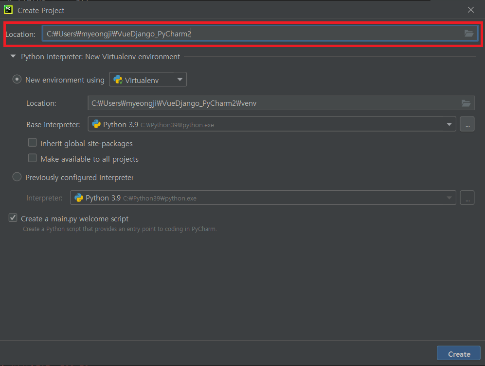 다른 프로젝트에서도 이 가상환경을 사용할 수 있도록 Make available to all projects를 체크해 줍니다.