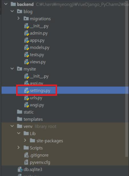 settings.py 파일은 장고 프레임워크의 프로젝트 환경 설정하는 파일입니다.