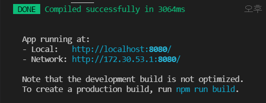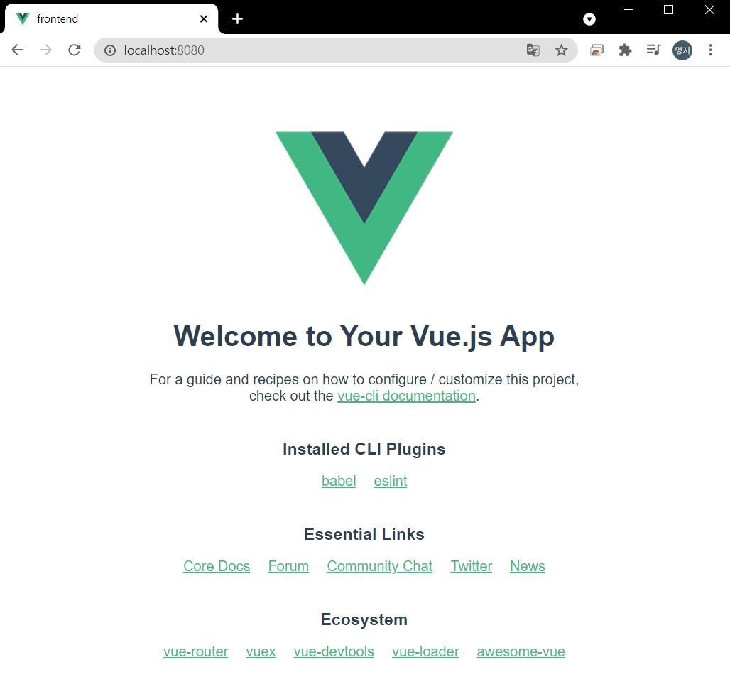 크롬(Chrome) 브라우저으로 접속 후 이러한 페이지가 나오면 성공적으로 vue가 설치된 것입니다.