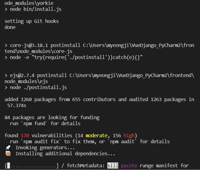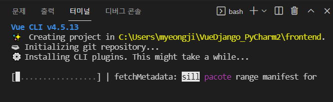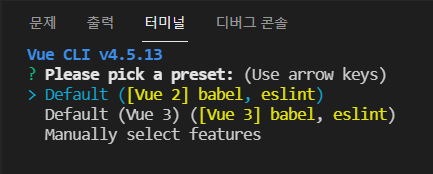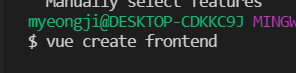 자신이 생성하고 싶은 프로젝트의 이름으로 vue 프로젝트를 생성합니다. 저는 frontend라는 이름으로 지정하였습니다.