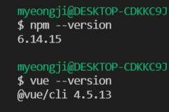 터미널 창을 열고 node.js 버전과 npm 패키지 버전, Vue.js의 버전을 확인합니다.