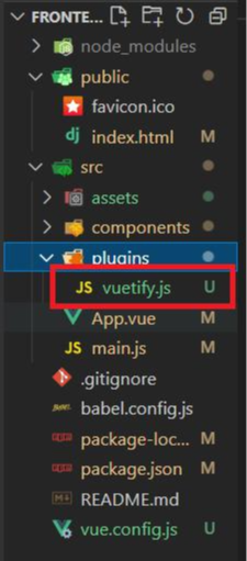 프로젝트 내 src/plugins 폴더 밑에 vuetify.js 파일 생성된 것 확인할 수 있습니다.