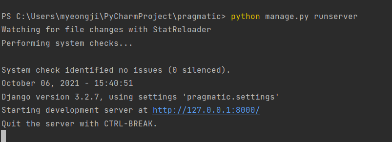 - python manage.py runserver 명령어 입력 후 서버 기동