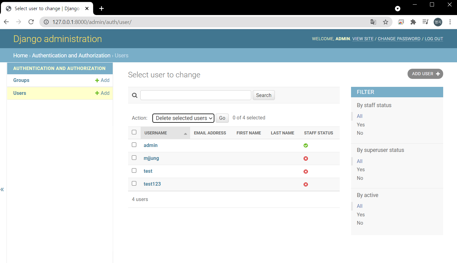 - 장고 기본 제공 Groups, Users 테이블 확인