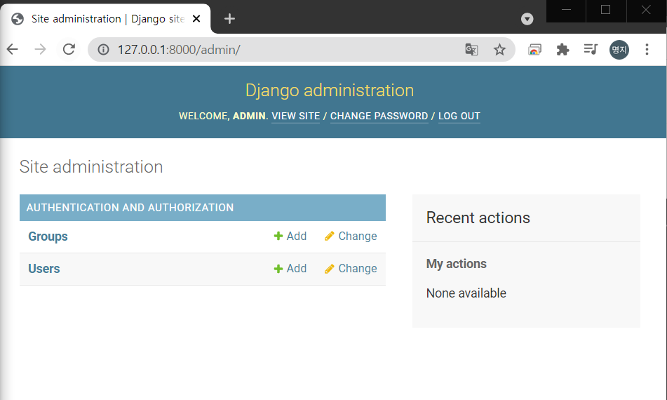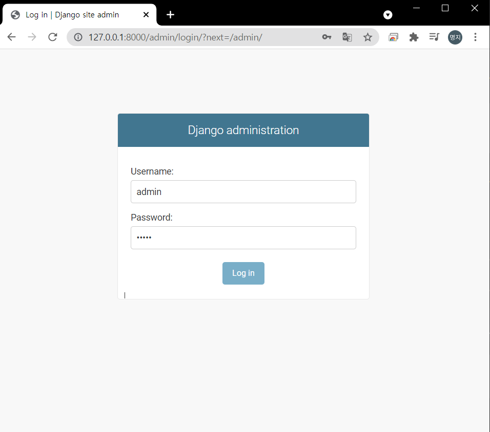 - http://127.0.0.1:8000/admin/ url로 이동 후 생성한 관리자 계정으로 로그인