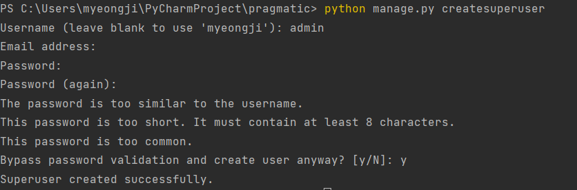 - 터미널 창에 python manage.py createsuperuser 명령어 입력