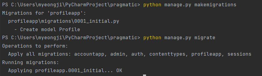 - 생성한 model 마이그레이션(migration)해서 db에 반영하기