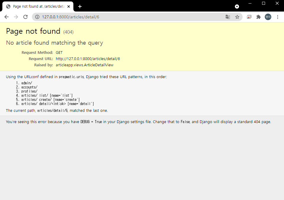 - 삭제 후 url 주소로 들어가면 not found error 뜨면서 성공적으로 삭제완료 확인