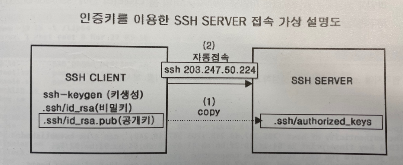 ssh 클라이언트에서 ssh-keygen 명령을 이용하여 비밀키와 공개키를 생성하고, ssh서버에 공개키를 복사하면 된다.