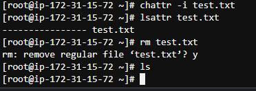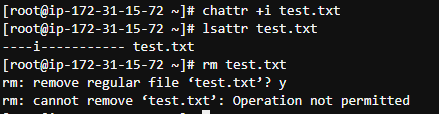 rm 명령어 실행시, root 관리자 계정임에도 불구하고 cannot remove 에러 메시지가 출력되면서 삭제할 수 없게된다.